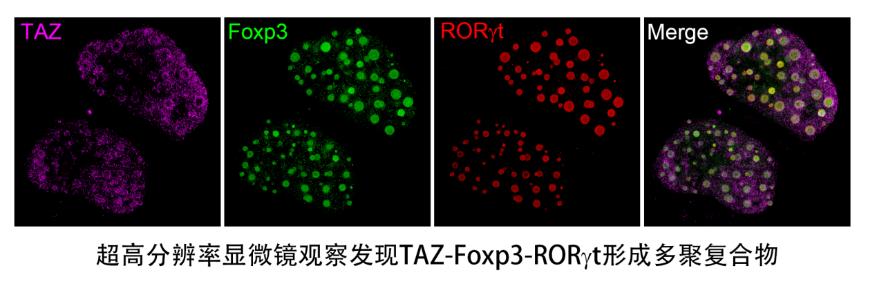 针对TAZ在TH17细胞培养分化条件下被诱导表达的现象,在深入的研究发现,诱导TH17细胞分化的两大信号IL-6和TGF-b下游的转录因子Smad3和STAT3协同促进TAZ基因的转录和表达。利用超高分辨率显微镜GE OMX V4观察和生化手段验证后发现,多聚化的TAZ能够同时与TH17细胞的核心转录因子RORyt和Treg细胞关键转录因子Foxp3形成复合物,TAZ能够促进RORyt转录活性但抑制Foxp3的功能,从而促进TH17细胞的分化和减弱Treg细胞的产生。