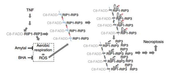 韩家淮教授课题组的这项研究表明,这两个科学问题是相关联的。研究人员利用质谱技术首次证实,RIP1通过其上的三个关键的半胱氨酸(C257,C268和C586)直接接受ROS的氧化调控,进而增强激酶活性,发生第161位丝氨酸(S161)的自磷酸化。他们证实了RIP1的激酶活性在程序性细胞坏死中的主要功能是自磷酸化S161,且S161就是人们长期寻找的RIP1上与坏死相关的功能性磷酸化位点。坏死小体的形成是程序性细胞坏死发生的必要复合物,而S161的磷酸化是RIP1有效募集RIP3形成有功能的坏死小体所必需的。由于ROS的产生依赖于坏死小体里的RIP3的功能,因此ROS介导了程序性坏死通路里的正反馈调控。
