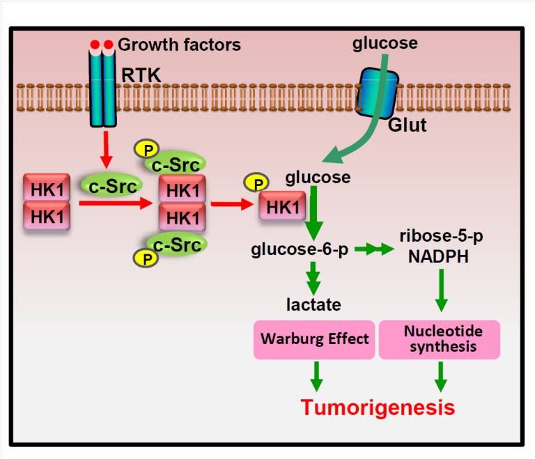 在这项研究中,研究人员发现c-Src在激活的情况下能够和HK相互结合,并且磷酸化Ⅰ型己糖激酶(HK1)的酪氨酸732位点以及Ⅱ型己糖激酶(HK2)的酪氨酸686位点。磷酸化修饰导致HK构象的改变,增强其对葡萄糖的亲和力,进而激活其催化活性。激活的HK使大量的葡萄糖被摄入转化为6-磷酸葡萄糖,促进糖酵解。深入的研究表明c-Src磷酸化HK能够促进肿瘤的形成和转移。在临床结肠癌和肺癌中HK1-Y732的磷酸化水平显著升高,且在转移瘤中高于原发瘤,说明检测该位点的磷酸化对相关肿瘤的治疗和预后评估有一定的借鉴作用。