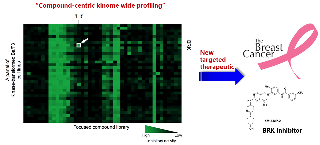 BRK是一种在多种肿瘤中高表达的蛋白激酶。在本研究中,研究人员首先对TCGA及Curtis两大乳腺癌数据库进行分析,发现BRK的表达与乳腺癌患者的生存率呈显著负相关,说明BRK在乳腺癌的发生发展中具有重要作用。因此,开发以BRK为靶点的小分子化合物在乳腺癌治疗中具有广阔的应用前景。通过“以化合物为中心”的高通量筛选策略,应用“靶向细胞毒”筛选平台,该研究团队发现并优化了以BRK为靶标的小分子化合物XMU-MP-2,它不仅能够显著地抑制BRK的激酶活性和下游信号通路,还能够促进BRK高表达的乳腺癌细胞凋亡(IC50在nM级别)。进一步的研究表明,XMU-MP-2是一个ATP竞争型抑制剂,通过与BRK的ATP结合口袋结合,有效地抑制BRK的激酶活性。同时,在BRK稳转Ba/F3细胞和BRK阳性乳腺癌细胞的小鼠移植瘤中,XMU-MP-2都表现出了优异的抑癌效果。不仅如此,当XMU-MP-2与HER2抑制剂CP724,714或雌激素受体(ER)抑制剂他莫昔芬联用时,均表现出明显的协同作用。该工作验证了激酶BRK可望作为乳腺癌治疗的药物靶标,为乳腺癌的靶向治疗提供新策略。这是邓贤明教授课题组继去年发现促进肝脏再生激酶MST1/2小分子抑制剂(Science Translational Medicine, 2016)后在激酶靶向药物研究中的又一成果。