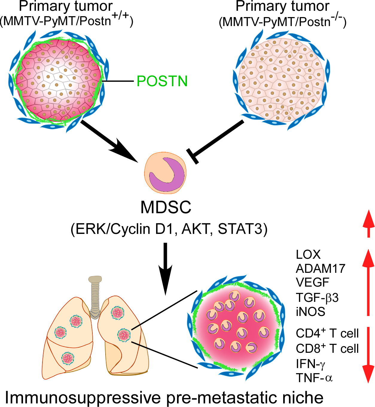肿瘤致死主要由肿瘤的转移及复发引起。目前研究认为肿瘤转移不仅依赖于肿瘤细胞自身的侵袭能力,还与肿瘤转移前微环境(pre-metastatic niche)的形成密切相关。转移前微环境的构建决定了侵袭至循环系统的肿瘤细胞能否在远方转移灶部位附着、生存、增殖并最终形成转移癌。细胞外基质蛋白Periostin与多种肿瘤的发生发展密切相关。Huelsken J.教授课题组的研究发现肿瘤成纤维细胞来源的Periostin蛋白决定了乳腺癌的肺转移效率以及转移癌的大小(Nature, 2012),欧阳高亮教授课题组在应邀对该文进行专题评述时指出Periostin蛋白很可能在肿瘤转移前微环境和血管周微环境(perivascular niche)中起重要作用(Cell Stem Cell, 2012)。有趣的是,Mina J. Bissell教授课题组的研究表明,Periostin的确在肿瘤血管周微环境中起重要作用,新生血管内皮的Tip cells(顶端细胞)可分泌Periostin等蛋白促进休眠的肿瘤细胞进行增殖性生长(Nat Cell Biol, 2013)。为了阐明Periostin蛋白是否在肿瘤转移前微环境中起作用,欧阳高亮教授课题组应用MMTV-PyMT小鼠自发性乳腺癌肺转移模型以及小鼠皮下脂肪垫移植瘤模型,发现Periostin蛋白在髓系来源的抑制细胞(MDSCs)介导的免疫抑制性转移前微环境的形成中具有重要功能,敲除Periostin可显著抑制MDSCs向肿瘤转移前微环境的募集并抑制免疫抑制性微环境的形成,从而抑制乳腺癌肺转移。该研究进一步从转移前微环境角度阐明了Periostin蛋白促进乳腺癌转移的作用机理,首次表明Periostin是一种新的肿瘤转移前微环境因子。
