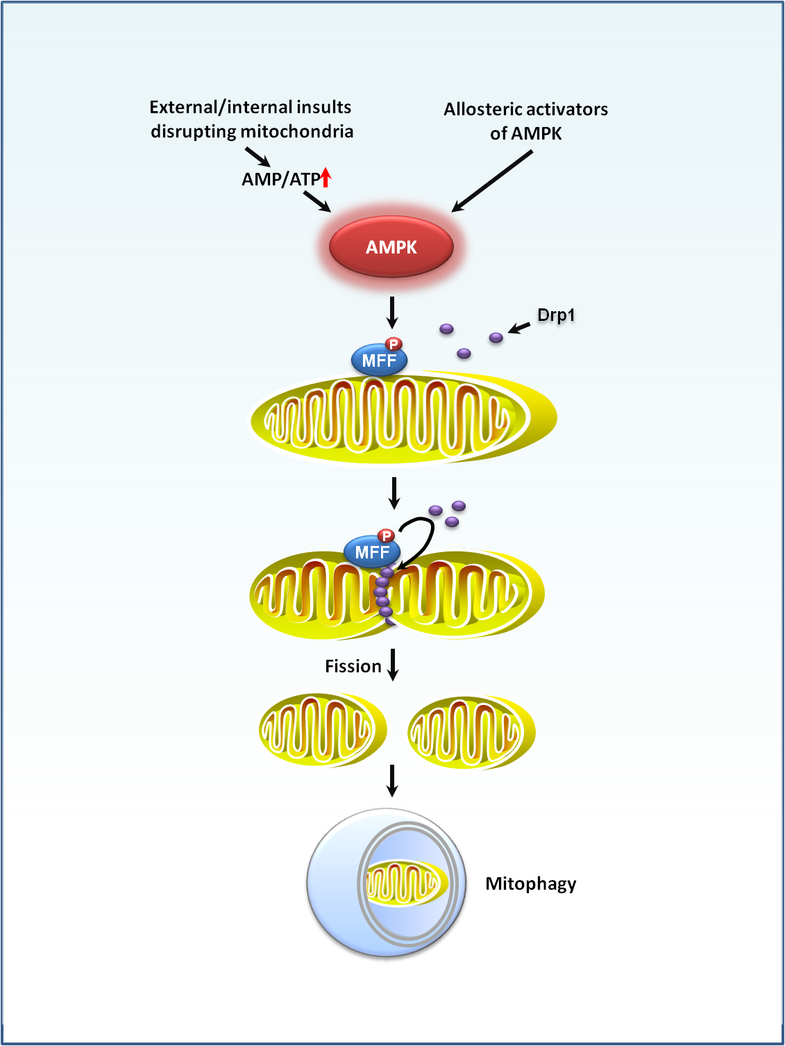 自噬是生物体内存在的一种基本的生命过程,而线粒体自噬(mitophagy)则是自噬作用的一大重要类型。在缺乏能量的环境下,线粒体中活性氧(ROS)水平上升,导致其部分结构和功能遭到破坏,这一结果严重影响了整个线粒体结构的完整和稳定,使之产能效率大大下降,细胞的生存受到威胁。为了解决这一问题,细胞通过一系列过程识别受损的这部分线粒体,通过线粒体分裂的方式,使这部分线粒体从完整的线粒体结构上分离出来,并通过线粒体自噬作用被降解,从而维持线粒体结构的完整和功能的正常运作。然而,缺乏能量的环境下细胞引起线粒体分裂的机制尚不清楚。今年1月15日,来自Salk Institute的Reuben J. Shaw课题组发现,AMPK在这一过程中起到了重要的作用。在缺乏能量的环境下细胞内的AMPK被激活,后者通过磷酸化下游蛋白MFF(mitochondrial fission factor),促进了多个和线粒体分裂相关的蛋白的进一步募集,从而引起线粒体分裂,这一重要成果发表在当期的Science杂志上。该研究首次将细胞内的能量感受器AMPK和线粒体分裂联系在一起,是自噬研究领域的重要进展,也是AMPK功能上的一项重大突破。