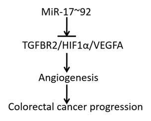一直以来,miR-17~92簇都被视为原癌基因,其在多种肿瘤组织中呈高表达,并和多种类型肿瘤的预后呈负相关。但是miR-17~92簇在结直肠癌发生发展中的作用如何尚无定论。为了回答这一问题,韩家淮课题组首先构建了在肠上皮细胞中特异性过表达miR-17~92簇的条件性转基因小鼠,然后通过AOM-DSS诱导结肠癌。通过对比miR-17~92簇转基因小鼠和野生型小鼠的肿瘤发生率、肿瘤直径等指标,发现过表达miR-17~92簇转基因小鼠的肿瘤直径明显小于野生型小鼠。并进一步通过体外实验揭示了相关的分子机制:miR-17~92簇通过抑制下游靶基因TGFBR2/HIF1α/VEGFA的表达,进而负调控肿瘤的血管生成,从而抑制肿瘤的生长速度。该研究发现了一个有趣的现象,所谓的“原癌基因”miR-17~92簇在结直癌的进展过程中并非真的起到促癌作用,反而抑制肿瘤生长。这也提示,如果临床上选择miR-17~92簇作为结肠癌的干预靶点需要更为审慎。