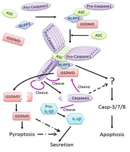 自然免疫反应依赖于宿主细胞的一系列模式识别受体(PRR, pattern recognition receptor),这些受体可以监测存在于胞内和胞外的病原体以及损伤信号,在该类信号刺激下,宿主细胞内会形成大的多蛋白复合体,称为炎症小体(inflammasome)。炎症小体会激活半胱天冬酶-1(Caspase-1),活化的半胱天冬酶-1会启动称之为焦亡(pyroptosis)的炎性细胞死亡程序,促进炎症因子的成熟和释放,例如白介素-1β(interleukin-1β)和白介素-18(interleukin-18)。