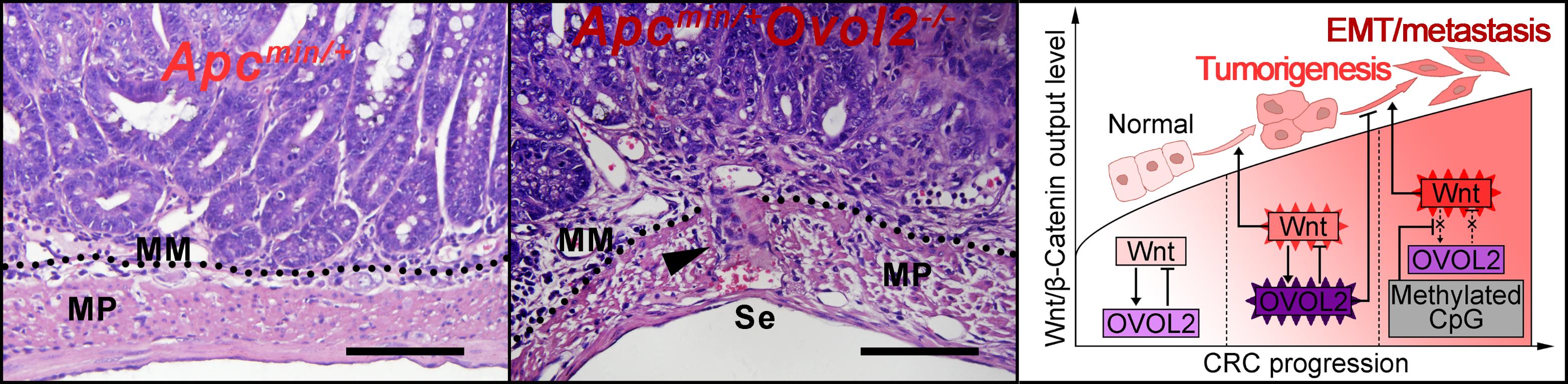 该研究论文以“OVOL2, an Inhibitor of WNT Signaling, Reduces Invasive Activities of Human and Mouse Cancer Cells and is Downregulated in Human Colorectal Tumors”为标题于2015年11月24日在 Gastroenterology 在线发表。该研究鉴定了一个新的结直肠癌转移抑制基因,揭示了Wnt信号触发结直肠癌侵袭转移的关键机制,从而为结直肠癌转移的诊断和治疗提供了一个新的靶点。