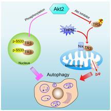 激活肿瘤细胞凋亡途径是当前临床治疗肿瘤的主要方法之一,但是长期的药物使用使得癌细胞对凋亡诱导产生抵抗,由此成为临床肿瘤治疗的重要障碍。因此,通过诱导细胞自噬性死亡在一定程度可以克服肿瘤细胞对凋亡药物的耐药性,是发展新型肿瘤治疗策略的潜在方向之一。吴乔和林天伟实验室前期合作发现了小分子化合物THPN可以通过TR3介导,以诱导自噬性死亡的方式特异性地抑制黑色素瘤的发生发展,但是对其它肿瘤则没有作用(Nat Chemical Biology, 2014)。为了进一步拓展THPN的应用,他们深入探讨了阻碍THPN诱导自噬的根本原因和机制。结果表明,在许多非黑色素肿瘤细胞中Akt2呈现高活性状态,通过磷酸化TR3 Ser533位点,使得TR3滞留细胞核,从而阻断THPN诱导的胞浆TR3-Nix结合,进而抑制TR3线粒体定位及由此产生的线粒体功能受损,最终阻断自噬性细胞死亡。因此,THPN联合Akt抑制剂、或者敲低Akt2就可以在细胞和动物水平上抑制不同类型的肿瘤生长。在此基础上,他们还以THPN为母体结构,通过解释THPN-TR3共晶结构,进一步优化化合物结构,合成不同的THPN衍生物,最终获得了一个诱导自噬抑制肿瘤生长等性能高于THPN效果的化合物。该研究不仅确定了干扰THPN诱导肿瘤细胞自噬性死亡的具体分子,阐明了一条TR3与Akt间的调控肿瘤耐药性的新途径,更为进一步拓展THPN的应用范围和研发新型的诱导自噬抑制肿瘤的药物提供了重要的理论基础。