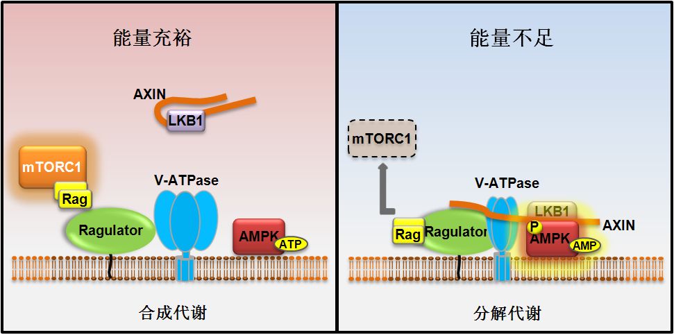 林圣彩教授课题组破解了这个“谜底”。他们发现了控制这两个截然相反的代谢路径的“开关”。让人诧异的是,它还竟然是同一个“开关”。这是一种分布在细胞内膜的名为“v-ATPase-Ragulator”的蛋白质复合体。通俗点儿说,当细胞内能量水平降低时,这个蛋白质的形状会发生变化从而让能激活AMPK的复合体与其相互作用,使之被激活。激活后的AMPK最终下达分解代谢“命令”。反之,当细胞内能量水平较高时,mTOR将与“v-ATPase-Ragulator”的蛋白质复合体相结合并被激活,开启合成代谢通路。