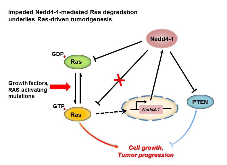Ras是第一个发现的与人类肿瘤直接相关的原癌基因,也是众多RTKs (receptor tyrosine kinase)信号的重要汇聚点。该论文研究发现HECT家族的E3泛素连接酶Nedd4-1会介导Ras蛋白的泛素化降解,抑制肿瘤的发生。当把小鼠正常成纤维细胞NIH3T3里的Nedd4-1敲低时,细胞会发生恶性转化并能在裸鼠皮下形成肿瘤。有趣的是,当Ras蛋白因点突变或受上游EGF信号刺激而激活时,会抑制Nedd4-1对其的泛素化降解。同时,癌细胞中过度激活的Ras信号还会通过负反馈调节增强Nedd4-1的转录,促使其降解抑癌蛋白PTEN,进而促进肿瘤的发展。