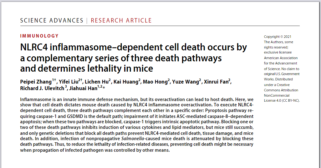 10月22日,Science Advances杂志在线发表了细胞应激生物学国家重点实验室韩家淮课题组题为“NLRC4 inflammasome–dependent cell death occurs by a complementary series of three death pathways and determines lethality in mice”的研究成果,揭示了在 NLRC4炎症小体过度激活的状态下可有顺序地分别激活三条死亡路线(即1:NLRC4-caspase-1-GSDMD焦亡通路;2:NLRC4-ASC-caspase-8凋亡通路;3:NLRC4-caspase-1-caspase-3凋亡通路)导致细胞死亡和小鼠死亡的分子机制。