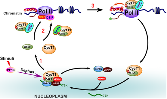真核基因的转录延伸受严密而精细的调控,其核心调控元件是正性转录延伸因子P-TEFb复合体。P-TEFb复合体的核心是由激酶Cdk9和辅助蛋白CycT1形成的异二聚体;在细胞中核心P-TEFb进一步形成无转录活性的7SK snRNP复合体(即P-TEFb/HEXIM1/MePCE/Larp7/7SK snRNA)以及有转录活性的Brd4/P-TEFb和SEC/P-TEFb活化复合体。这两类P-TEFb复合体各自约占50%,彼此之间通过相互转换改变细胞内的各自占比,从而适应细胞不同的转录需求。早在2008年,该团队在Genes & Development上揭示了钙离子信号通过去磷酸化Cdk9 T186位点解离无转录活性的7SK snRNP复合体并释放核心P-TEFb的分子机制;2016年该团队在Nucleic Acids Research上进一步揭示活化的Brd4/P-TEFb和SEC/P-TEFb复合体如何重新启动暂停的转录延伸过程。然而,这两者之间的衔接过程,即解离后的核心P-TEFb如何进一步形成活化复合体仍不清楚。
