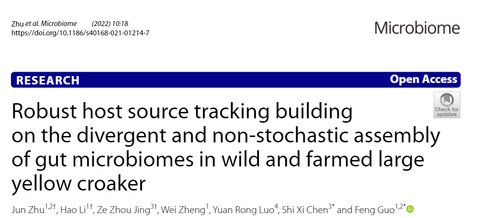 2022年1月26日,厦门大学生命科学学院郭峰副教授课题组在Microbiome期刊在线发表了题为“Robust host source tracking building on the divergent and non-stochastic assembly of gut microbiomes in wild and farmed large yellow croaker”)的研究论文,探究了野生与养殖大黄鱼的肠道微生物的组成与功能上的差异,并且利用上述特征建立了可靠的鱼类宿主溯源方案。