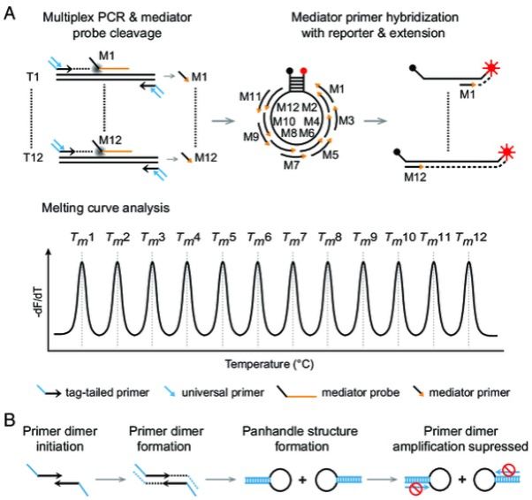 该技术实现的关键是获取一种具有“多泊位”的报告探针,以容纳众多的媒介引物。研究人员首先比较了线性探针和分子信标分别用作报告探针的优劣,分子信标因具有清晰的背景而胜出。接着,作者考察了分子信标的“多泊位”能力。他们小心翼翼地从两重PCR开始,首先证明一个分子信标可以允许两个“媒介引物”停泊;又通过一个四重PCR,证明了一个分子信标可以允许四个“媒介引物”叠加式停泊,由此,提出了一个分子信标可以容纳任意多个媒介引物的假设。根据目前荧光PCR仪器的熔点分辨率,利用两个分子信标,实验验证了单个荧光通道即可检测12个靶基因。最后研究人员构建了一个阵列式结构的“媒介子”库及其对应的分子信标报告探针,以实现检测的标准化。为降低多重PCR中多对引物并存可能产生的引物二聚体干扰,研究人员又引入了“PCR抑制”概念,至此提出了MeltArray的完整技术原理(图1)。