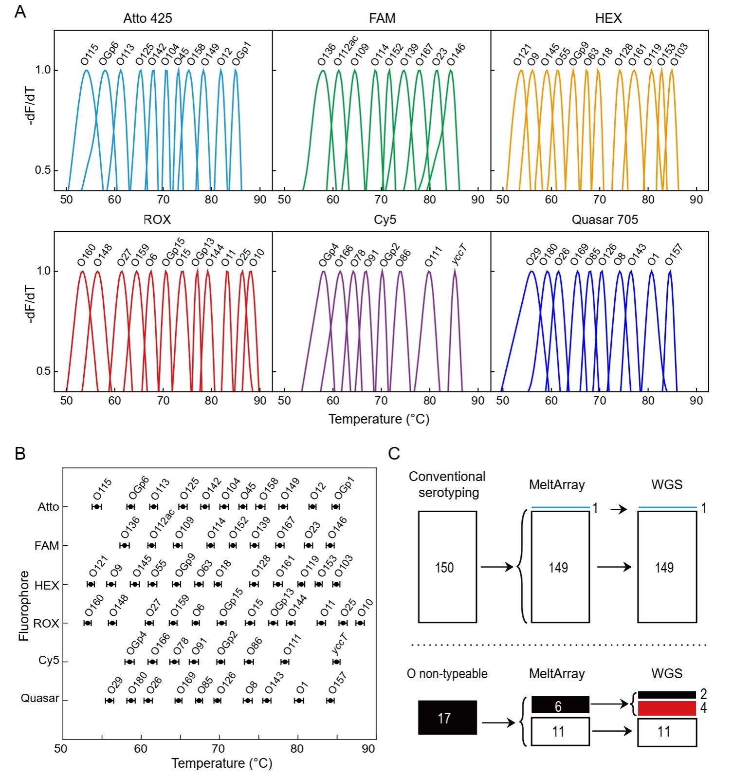 受以上结果鼓舞,作者开始挑战更多的靶标数目。这次,他们使用六个荧光通道设计了一个62重PCR的MeltArray检测体系(图3),用于识别61种O抗原合成基因及1个大肠杆菌管家基因yccT。我们看一下此时每个通道的检测数目,按照荧光波长从低到高的次序,六个荧光通道检测的靶标数目分别是11、9、12、12、8和10个!各个通道的重复实验结果采用3倍标准偏差显示,每一个靶标对应的熔点值均稳定且能明确区分。最后,作者利用该体系鉴定了167株大肠杆菌培养株的血清型,除了覆盖范围之外的4株,检测结果与全基因组测序结果完全一致,而且比传统抗血清法多鉴定出11株,还另外纠正了其鉴定错误的1株。
