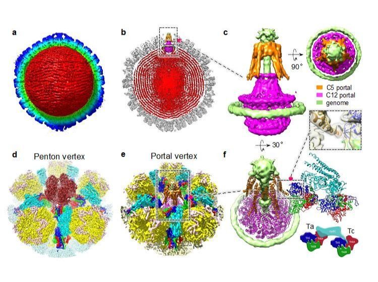 2022年3月22日,夏宁邵教授团队在《自然》子刊《自然•通讯》(Nature Communications)上发表题为“Structures of pseudorabies virus capsids”的研究论文。该论文首次揭示了疱疹病毒科α家族的伪狂犬病毒(pseudorabies virus, PRV)不同类型核衣壳的近原子分辨率结构,以及衣壳相关皮层蛋白复合体(capsid-associated tegument complex, CATC)、基因组进出门户蛋白复合体(portal complex)的原位结构,阐明了PRV衣壳装配以及病毒基因组包装、稳定和释放机制,为PRV抗病毒药物和PRV作为溶瘤病毒药物的研究提供重要信息支持。