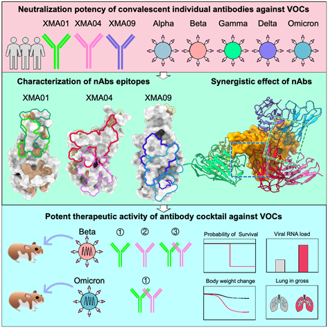 夏宁邵教授团队在新冠疫情暴发后快速投入到新冠中和抗体及其广谱中和表位鉴定的科研攻关中。在疫情初期,研究团队基于小鼠序贯免疫策略,筛选获得两株能够抵御新冠病毒变异株的广谱中和抗体,并鉴定了其识别的冠状病毒Sarbe亚属隐匿性广谱中和表位(Nat Commun. 2021,12(1):5652)。随后,研究团队和深圳三院合作,证实疫苗能够诱导出有效对抗Omicron变异株的广谱中和抗体,并且靶向了一类受体结合基序(RBM)附近的公共的保守表位(Cell Res. 2022,32(5):491-494)。在前期研究的基础上,研究团队开始探索如何进一步发挥中和抗体的保护或治疗作用。相较于单一抗体,抗体组合的鸡尾酒疗法具有更强的中和效力及突变耐受能力。在该研究中,研究团队首次发现RBD上存在的三个广谱中和表位能够同时被三株中和抗体(XMA01、XMA04及XMA09)所识别,并且在动物模型上验证了相关抗体鸡尾酒疗法的高效治疗效果。该抗体组合的发现与鉴定对应对未来潜在的新变异株以及其他冠状病毒大流行方面具有重要的储备价值,同时有助于指导新一代通用新冠疫苗的研发。
