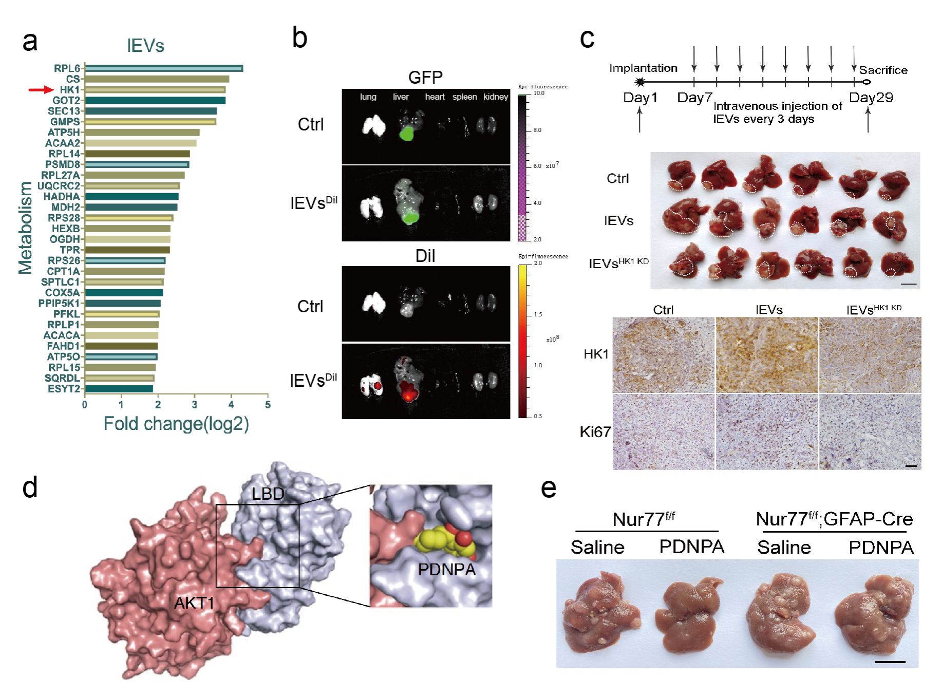 (a)激活的HSCs胞外囊泡中HK1外泌变化位于前列。(b)肝癌吸收DiI标记的HSCs来源的胞外囊泡。(c)尾静脉注射lEV HK1促进肝癌进程。(d)化合物PDNPA靶向Nur77配体结合域(LBD)形成空间位阻抑制Akt与Nur77的结合。(e)PDNPA靶向HSCs内Nur77抑制肝癌进程。