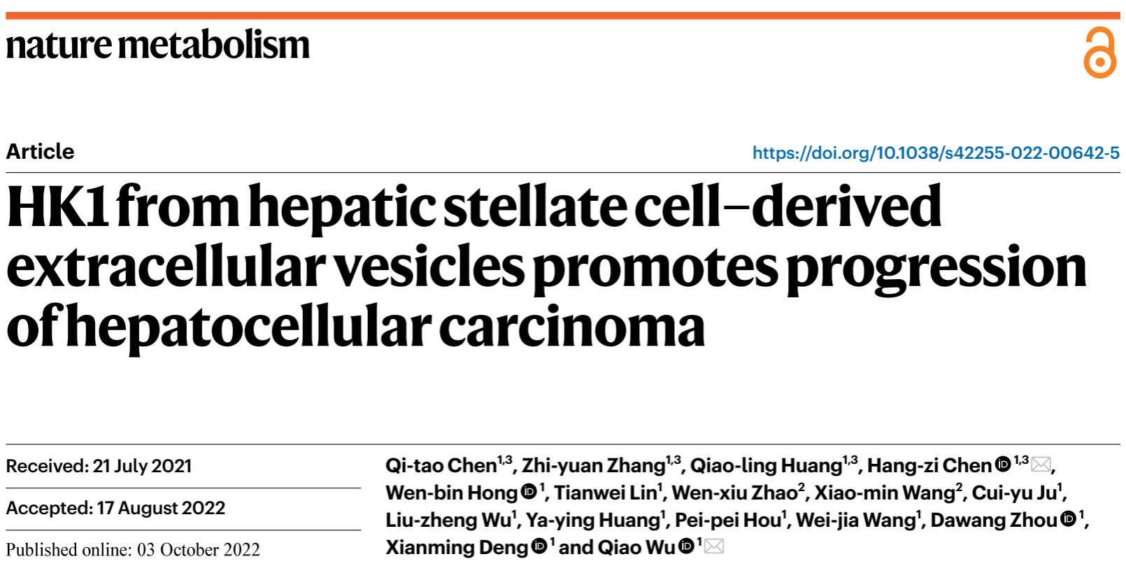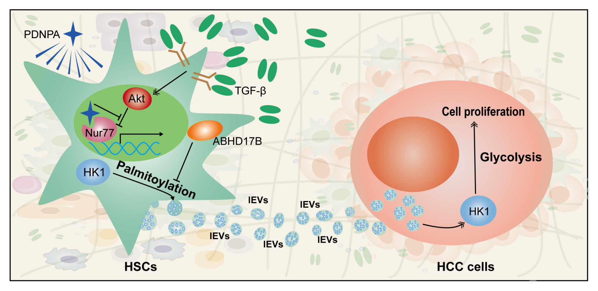 2022年10月3日,吴乔教授课题组在Nature Metabolism在线发表题为“HK1 from hepatic stellate cell-derived extracellular vesicles promotes progression of hepatocellular carcinoma”的研究论文。研究阐明肝脏纤维化过程中,TGF-β诱导HSCs中己糖激酶HK1的棕榈酰化修饰,促进HK1通过胞外囊泡外泌,而肝癌细胞则劫持纤维化HSCs来源的胞外囊泡HK1来增强自身糖酵解能力从而促进肝癌细胞增殖;此外,研究发现小分子化合物PDNPA通过靶向核受体Nur77阻断TGF-β诱导的HK1外泌,进而抑制肝癌进程,揭示PDNPA抑制HK1外泌的新功能。