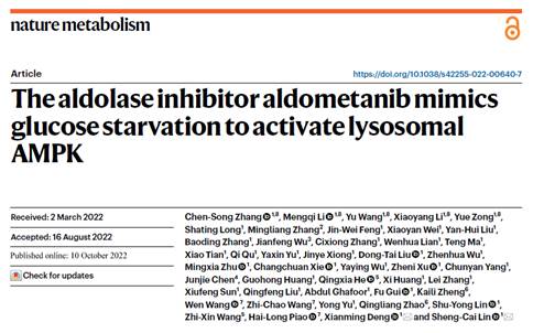 我院林圣彩院士与邓贤明教授合作,经过六年的努力,结合了辟谷、卡路里限制等生理条件,基于林圣彩课题组近年来开辟的机体内AMPK激活的全新通路,开发了一个AMPK激活剂—— “Aldometanib”,中文意译为“辟谷精”(图1),并十分有望借此实现人类健康长寿的梦想。文章于2022年10月10日以The aldolase inhibitor aldometanib mimics glucose starvation to activate lysosomal AMPK为题在线发表于Nature Metabolism杂志上。