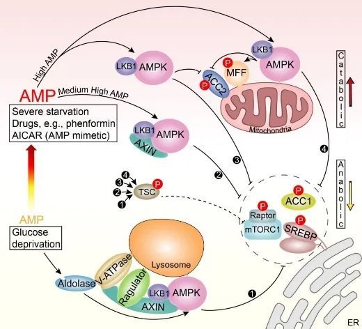 这就要追溯到林圣彩院士团队十多年前就开始的,关于细胞和机体内AMPK激活机制的研究了。通过这些年的研究,他们逐步发现了AMPK如何感知葡萄糖水平而被激活的机理。最近,这一机理被命名为“林通路”。林通路的发现改变了人们对AMPK激活的认识。经典的观点认为,AMPK的开启只和细胞内能量水平有关,也就是当能量水平下降的时候,体内的供能物质ATP水平下降,ATP供能以后的水解产物ADP和AMP水平上升。根据生化原理,ADP水平的上升进一步引起AMP水平的剧烈上升,后者则结合AMPK并引起AMPK的激活,而这也是AMPK的命名由来。也正因此,AMPK一直被误以为只有能量水平下降时,AMPK才被激活。林圣彩团队则发现,葡萄糖水平下降时,AMPK能够在ATP水平下降之前就被激活,及时补充了潜在ATP的不足。与之对应的,此时葡萄糖水平的下降是通过其代谢产物,糖酵解途径的果糖1,6-二磷酸水平的下降,进一步导致了越来越多的催化果糖1,6-二磷酸的醛缩酶变得不被果糖1,6-二磷酸结合,将此信号通过一系列的分子机制传导至激活AMPK蛋白质复合体,将AMPK激活(图2)。可见,林通路是一种精密而灵敏的调节AMPK的方式,有助于我们机体快速地响应营养物质的缺乏,启动AMPK的作用和相关的维持代谢稳态的过程。此外,和经典通路相比,林通路还具有激活特异区域的AMPK的特性,也就是它激活的并不是整个细胞内的所有AMPK,而只是定位在溶酶体这个细胞器上的那一小部分AMPK(图2)。如后文所述,正是林通路的这一独特的性质,使得它为开发有临床意义的AMPK激活剂提供了原理和思路,否则细胞动辄就启动所有的AMPK“库”,就会引起如心肌肥大等副作用。