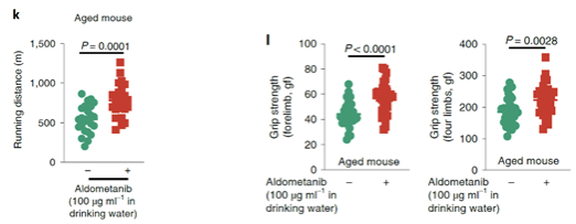 图4. “辟谷精”提升老年小鼠的运动能力(如跑步距离;左)和肌肉力量(如抓握力;右)