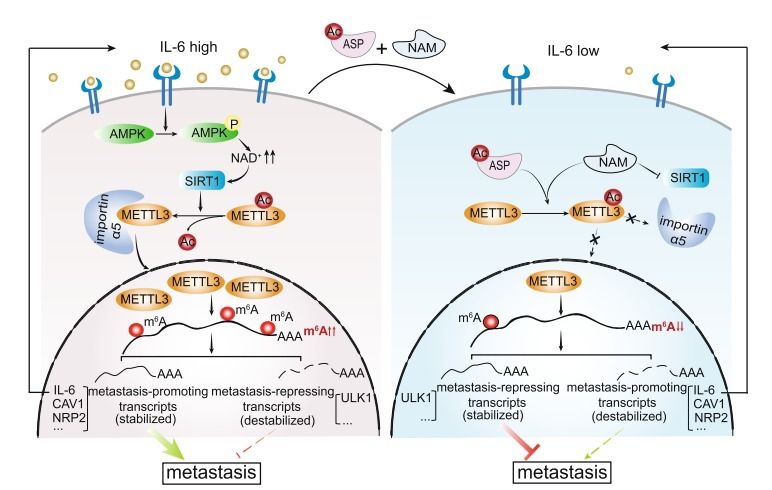 该团队在多种肿瘤细胞系以及临床肿瘤组织样本中发现:METTL3核质分布规律与肿瘤的侵袭转移潜能高度相关。其中高转移的肿瘤细胞中,METTL3以胞核分布为主;低/无转移肿瘤细胞中,METTL3以胞浆分布为主。该研究进一步发现:METTL3乙酰化修饰导致其核质分布差异;p300和SIRT1分别负责METTL3 K177位点的乙酰化/去乙酰化修饰;乙酰化削弱METTL3入核,将其阻滞在胞质,导致转录组m6A整体修饰水平显著降低;其中促转移相关基因(包括IL-6等)显著下调;但是乙酰化诱导的METTL3胞质定位能够显著促进蛋白翻译,上调抑制转移的蛋白表达水平。该工作还揭示肿瘤微环境中的IL-6可以激活AMPK-SIRT1信号通路,促进METTL3去乙酰化并入核,显著上调整体m6A水平,进一步提高IL-6表达,从而形成正反馈环路。该正反馈调节环路对肿瘤转移至关重要。利用移植瘤动物模型,该团队还发现联合使用阿司匹林(ASP)与烟酰胺(NAM)可以通过乙酰化METTL3抑制肿瘤转移。