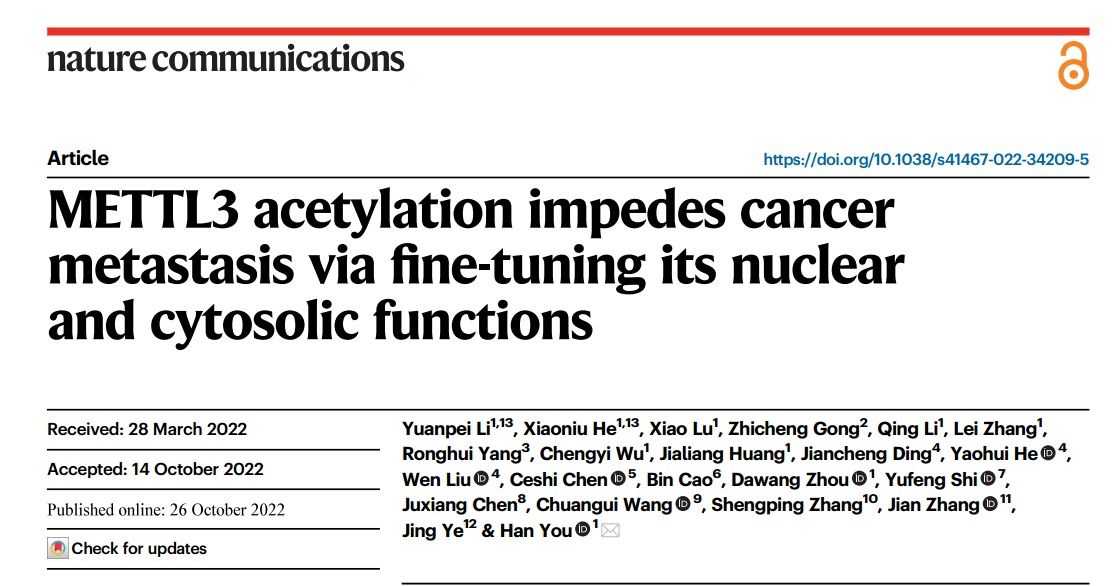 近日,我院尤涵教授研究团队在Nature Communications上发表题为METTL3 acetylation impedes cancer metastasis via fine-tuning its nuclear and cytosolic functions的研究论文。该研究揭示乙酰化修饰动态调控METTL3的核质定位以及肿瘤侵袭转移的分子机制。