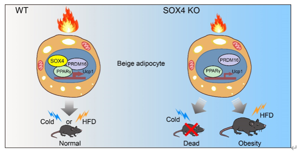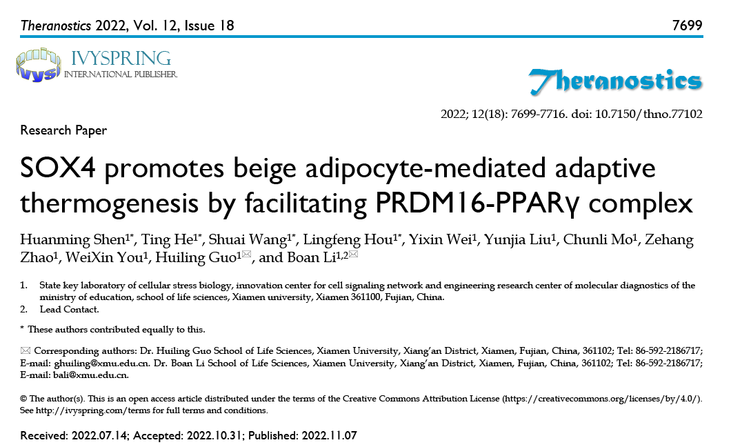 SOX4是调控干细胞特性、分化和多种发育途径的重要发育转录因子。近日,厦门大学生命科学学院李博安教授与郭慧玲助理教授团队在《Theranostics》发表论文,发现在长期冷刺激下,SOX4可以通过促进PRDM16-PPARγ复合体形成促进米色脂肪细胞介导的适应性产热。