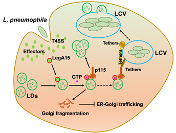 嗜肺军团菌(Legionella pneumophila)是一种非典型的胞内致病性细菌,会引起社区获得性或医院获得性的肺炎。该菌同时通过Dot/Icm IV型分泌系统(Dot/Icm type IV secretion system ,T4SS)向宿主细胞分泌300多个效应蛋白,调控多种宿主的生理活动,逃避宿主的免疫系统并繁衍。这些效应蛋白的重要功能之一是招募宿主的内质网等内膜成分,形成一种包含嗜肺军团菌囊泡(Legionella containing vaccule, LCV)。一般认为嗜肺军团菌的效应蛋白劫持宿主中的小G蛋白调控内质网-高尔基体囊泡与LCV融合,促进军团菌的生长。