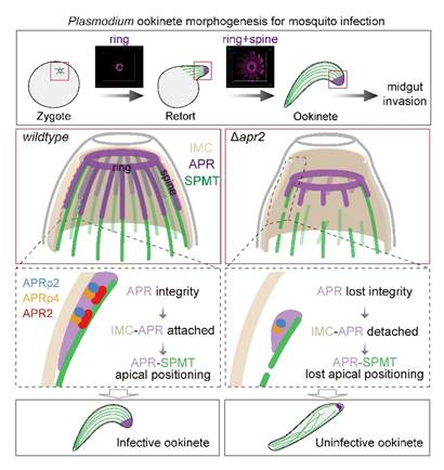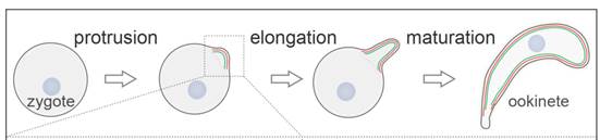 疟原虫是寄生原生动物类病原,每年导致数亿人口感染疟疾和超过60万人死亡。疟疾的传播严格依赖雌性按蚊。疟疾病人被按蚊叮咬吸血后,疟原虫伴随血液作为“食物”进入按蚊中肠。为了避免被消化酶分解,疟原虫进化出高效的感染、寄生和传播的适应性机制。在中肠肠腔内,疟原虫受精卵合子(Zygote)需要变形为新月形动合子(Ookinete),才能穿越中肠上皮,定植在中肠基底(体腔)侧,建立按蚊感染。动合子变形,包括极性突出-极性延伸-成熟,依赖表膜微管骨架的建立。