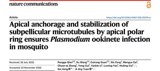 12月20日,袁晶课题组在Nature Communications杂志在线发表了题为 “Apical anchorage and stabilization of subpellicular microtubules by apical polar ring ensures Plasmodium ookinete infection in mosquito” 的研究论文。该研究揭示了疟原虫顶端极环锚定动合子表膜微管和调控细胞变形的分子细胞机制。