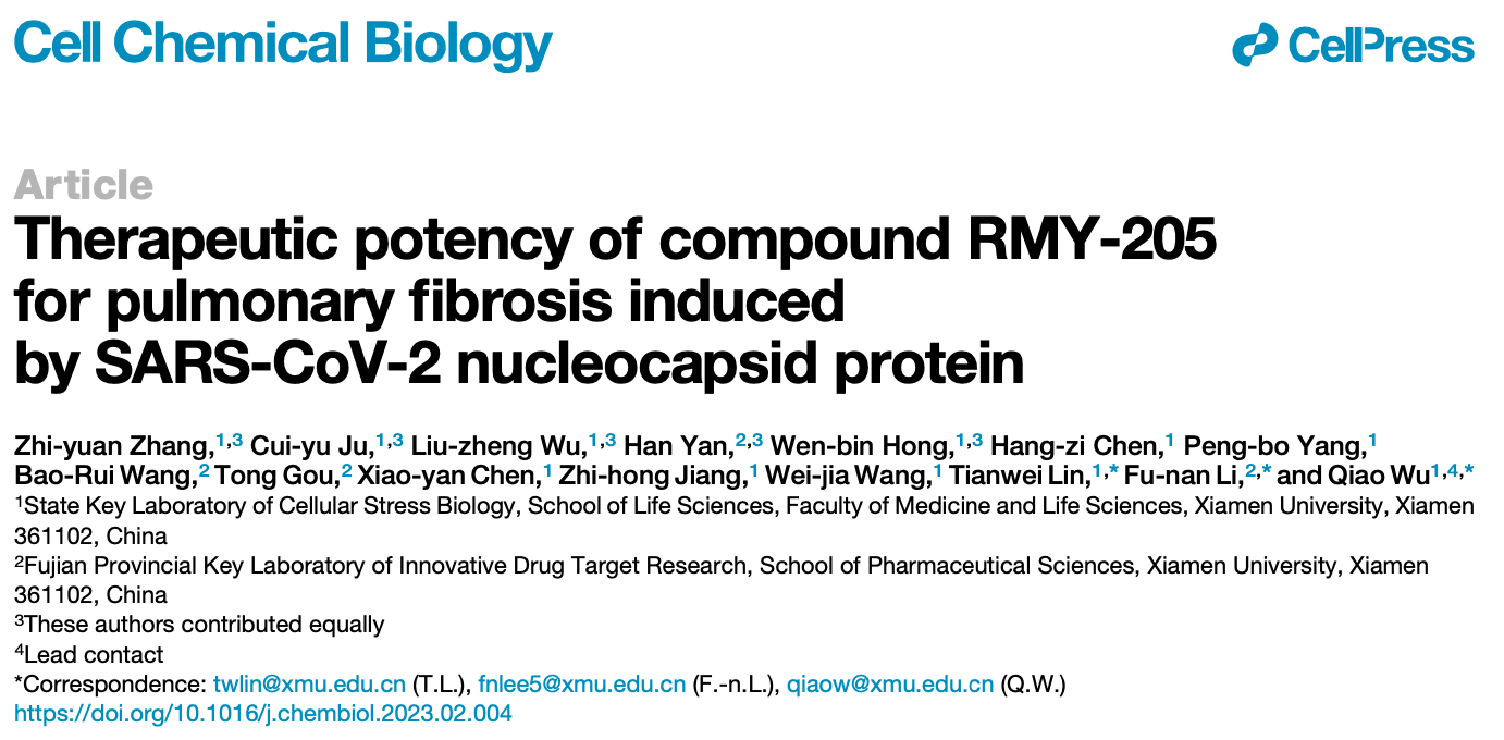 2023年3月16日,我院吴乔、林天伟和药学院李福男三个课题组合作在Cell Chemical Biology发表题为“Therapeutic potency of compound RMY-205 for pulmonary fibrosis induced by SARS-CoV-2 nucleocapsid protein ”的研究成果,揭示了SARS-CoV-2编码的N蛋白通过激活肺成纤维细胞促进肺纤维化进程,并开发出有效的抗纤维化的小分子化合物RMY-205。