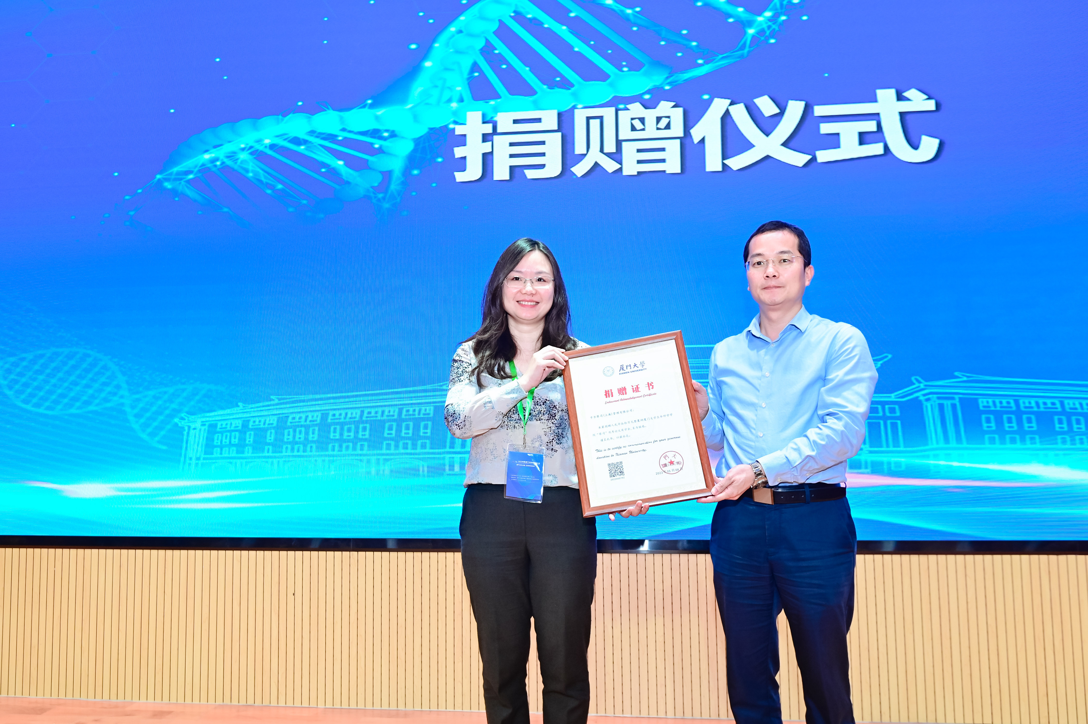 院长邓贤明为两位校友颁发“厦门大学生物学科杰出校友纪念牌”,为设立微风助学金的张育薪校友和设立蔡司奖学金的蔡司公司代表张宁女士授予捐赠证书。