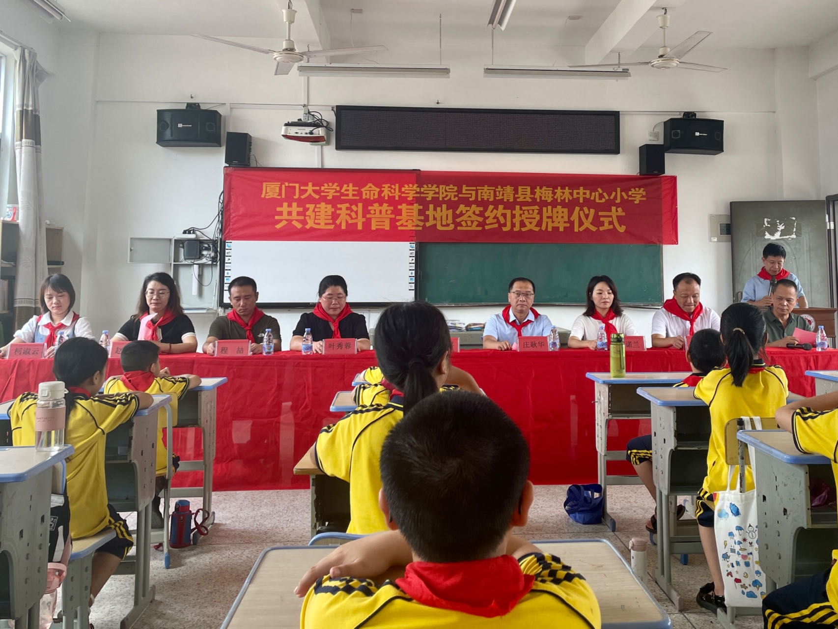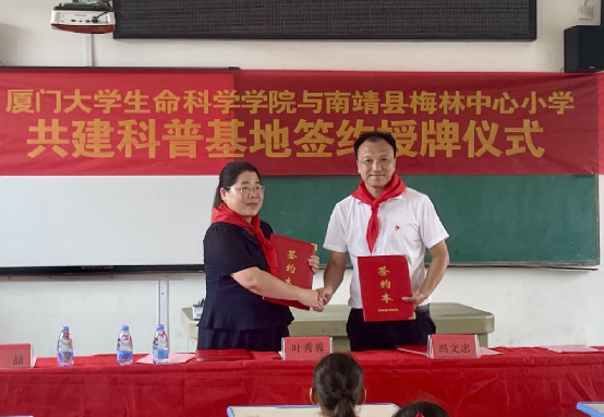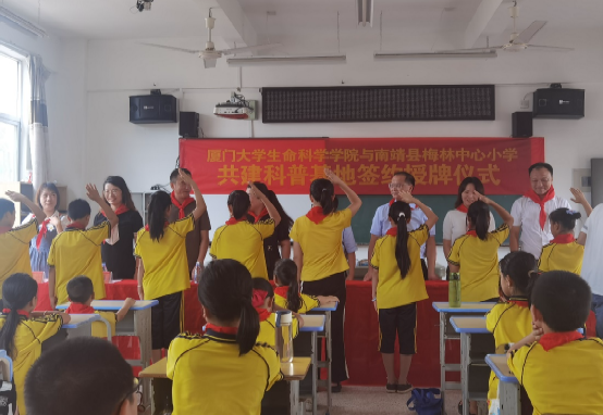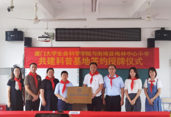 7月11日上午,在漳州市南靖县西部山间的小学校园里,生命科学学院和梅林中心小学举行厦门大学生命科学学院科普基地共建仪式。厦门大学生命科学学院副院长李勤喜、院党委副书记叶秀蓉、学院副教授程喆、院团委书记赵小姝,南靖县教育局副局长庄耿华,南靖县团县委青少年活动中心主任柯淑云,南靖县梅林镇副镇长方诺兰,梅林镇梅林村、梅兴居委会书记、主任,梅林中心小学校长冯文忠,梅林中心小学部分师生、家长以及厦门大学生命科学学院暑期社会实践队成员参加仪式。