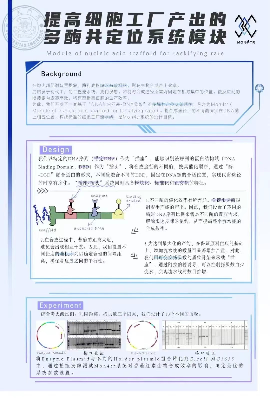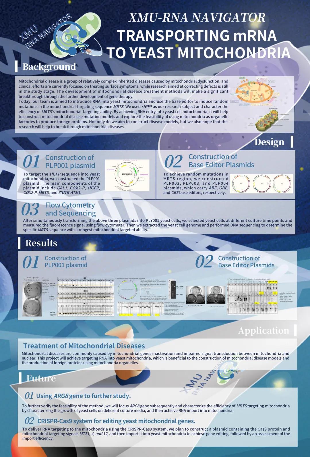 最终,我院罗周卿教授指导的两支团队“XMU-RNA Navigator”和“Mon4tr”分获大赛金奖和银奖。金奖团队“XMU-RNA Navigator”借助RNA运往线粒体的靶向序列将RNA导入线粒体,旨在开发可靠的线粒体mRNA递送技术为纠正患者中引起疾病的线粒体DNA突变铺平道路;银奖团队“Mon4tr”开发了一套基于“DNA结合亚基-DNA骨架”的多酶共定位支架系统,将生物合成途径所需酶固定在相对集中的位置,使反应间的衔接更为紧凑高效,提高细胞的生产效率。