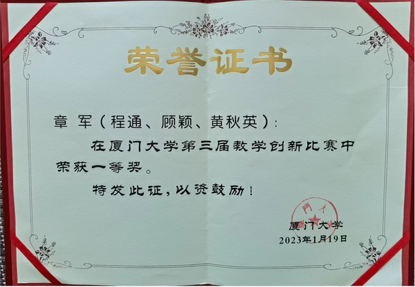 本次大赛采用校赛、省赛、全国赛三级赛制,2022年12月章军老师(团队)获厦门大学第三届教学创新比赛一等奖,2023年1月荣获第三届福建省高校教师教学创新大赛一等奖,顺利进军全国赛,并取得优秀成绩!
