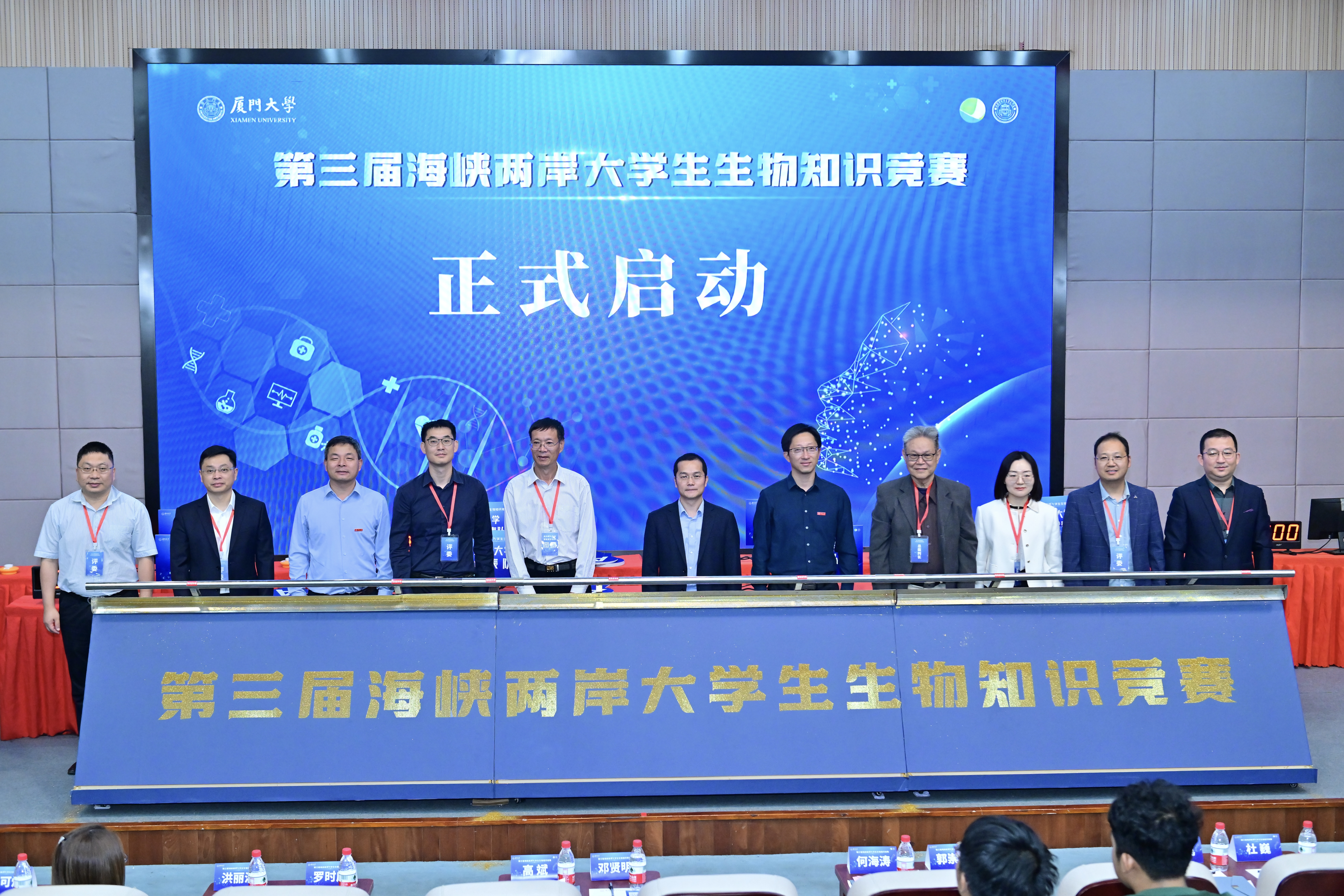 大赛正式开始前,海峡两岸8所高校队伍的指导老师与厦门大学相关部门的领导和嘉宾走上舞台,在全场师生的共同见证下推动启动杆,启动此次第三届海峡两岸大学生生物知识竞赛。