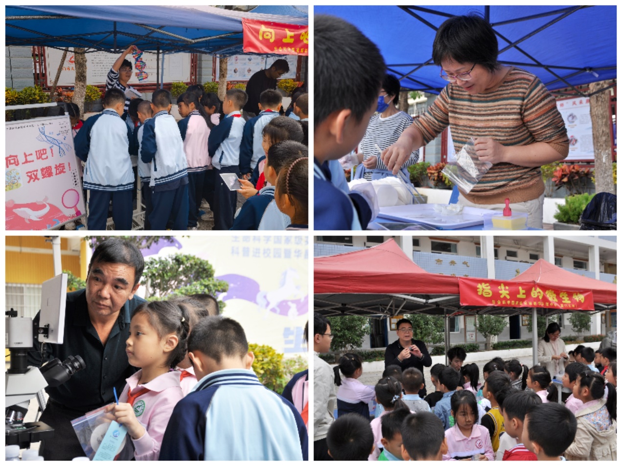 “精彩的显微世界”通过教学显微镜观看不同昆虫口器的微观结构、单细胞植物硅藻的细胞形态以及原生动物草履虫的游动方式和结构特点,让小朋友们认识了各种美丽神奇的小生物;“谍报员初体验”项目,通过指导小朋友在白纸上用隐形墨水写上自己的密语,然后在老师和志愿者的帮助下让密语显现,了解密语显示的原理,见识科学知识的神奇;“指尖上的微生物” 通过让小朋友们在平板上摁手印并且观察细菌生长,了解微生物的相关知识,认识到保持良好卫生习惯的重要性;“向上吧!双螺旋!”项目里,在老师和志愿者们指导下,小朋友们一睹神秘遗传密码的真容,了解脑海中比较陌生的概念——DNA双螺旋,亲手组装DNA双螺旋模型,这些都为年幼的他们早早打开了分子生物学的大门!