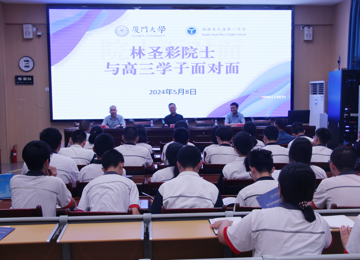 5月8日至9日,厦门大学三明招生宣传组一行赴尤溪一中、宁化一中、沙县一中、永安一中、三明二中、三明一中和大田一中7所中学开展优质生源基地挂牌、招生宣讲、科普宣讲和座谈交流等活动。林圣彩院士与尤溪一中高三学子面对面交流,并举办科普讲座。