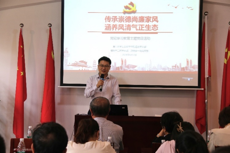 学院关工委常务副主任、退休支部党员黄田分享了参加党纪学习教育的体会,指出党员同志们应当做到集中学习与自主学习双向发力,在紧张的科研活动中,充分利用集中学习机会、高效安排自主学习时间,将党纪学习教育融入日常学习、科研、工作中。他强调,每位党员同志都应当常常自觉对照党规党纪,严格要求和审视自己,及时修正行为偏差。黄老师介绍了关工委的工作职责,鼓励青年学生主动与老党员、老同志加强交流,也希望进一步发挥“五老”作用,助力青年成长成才。