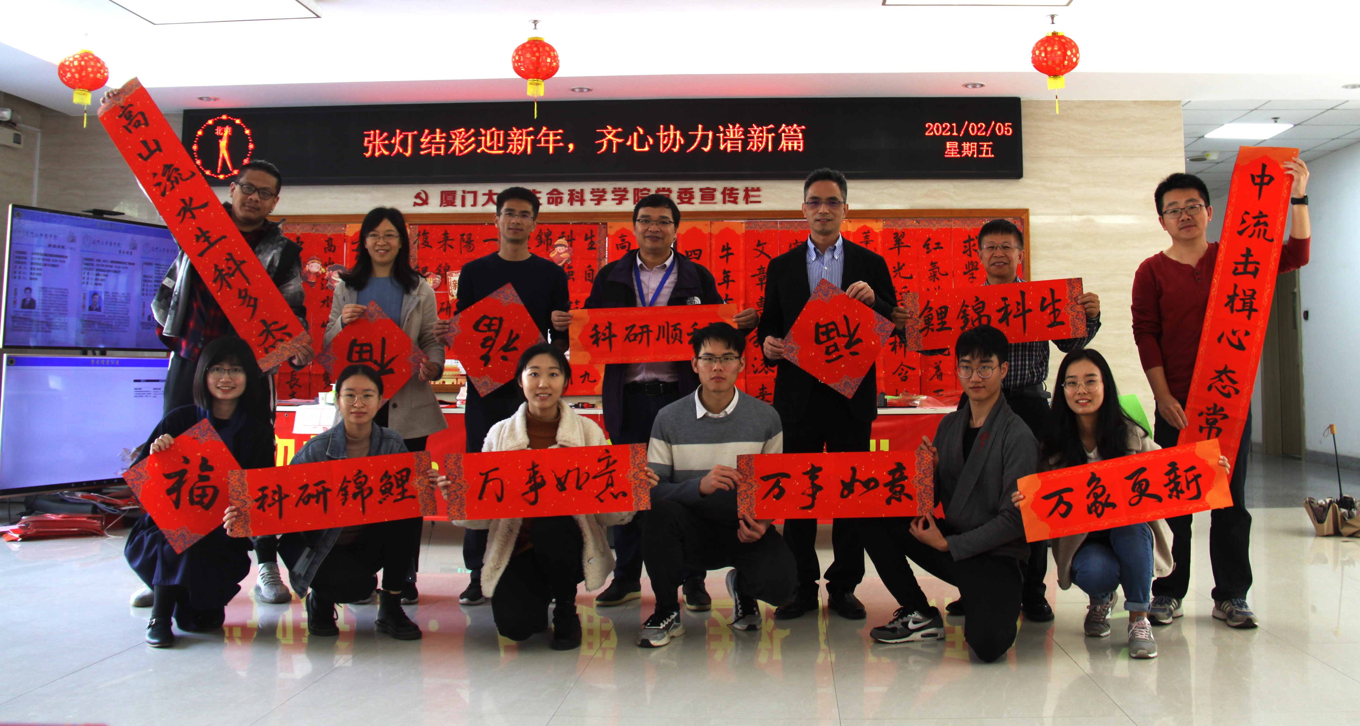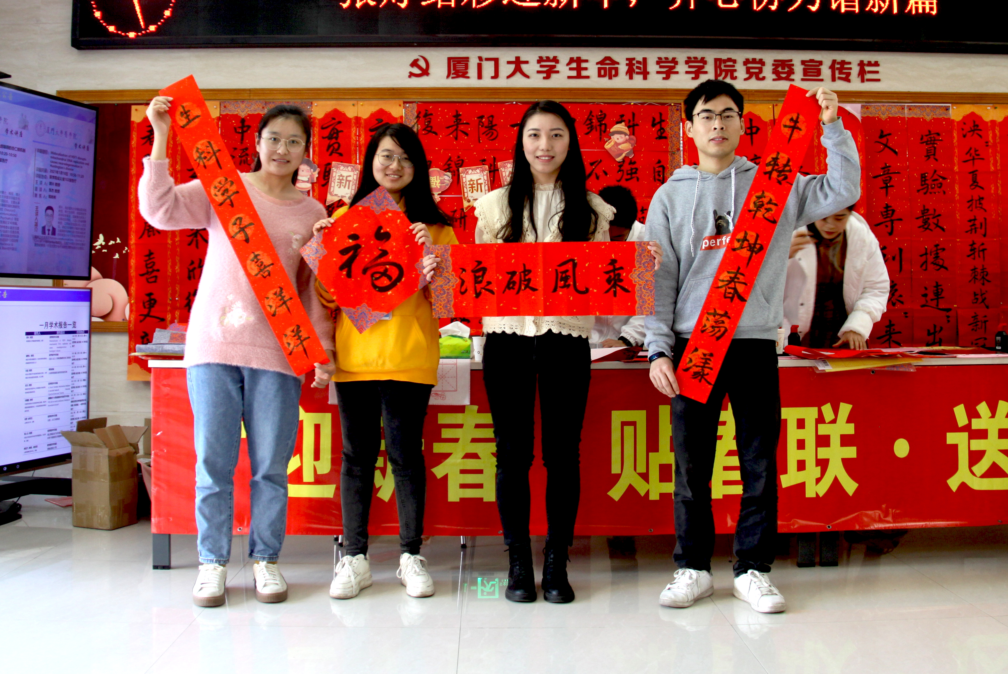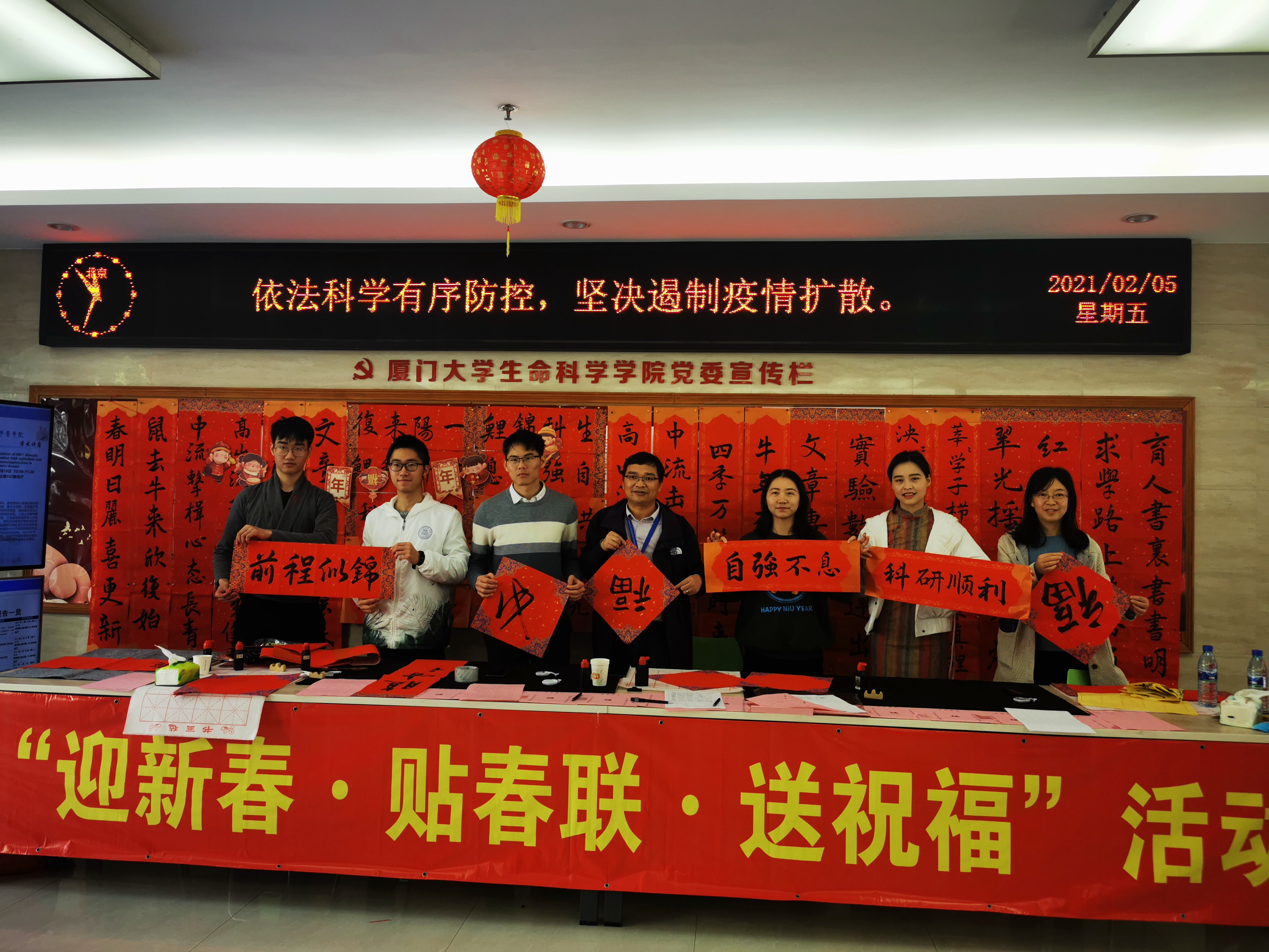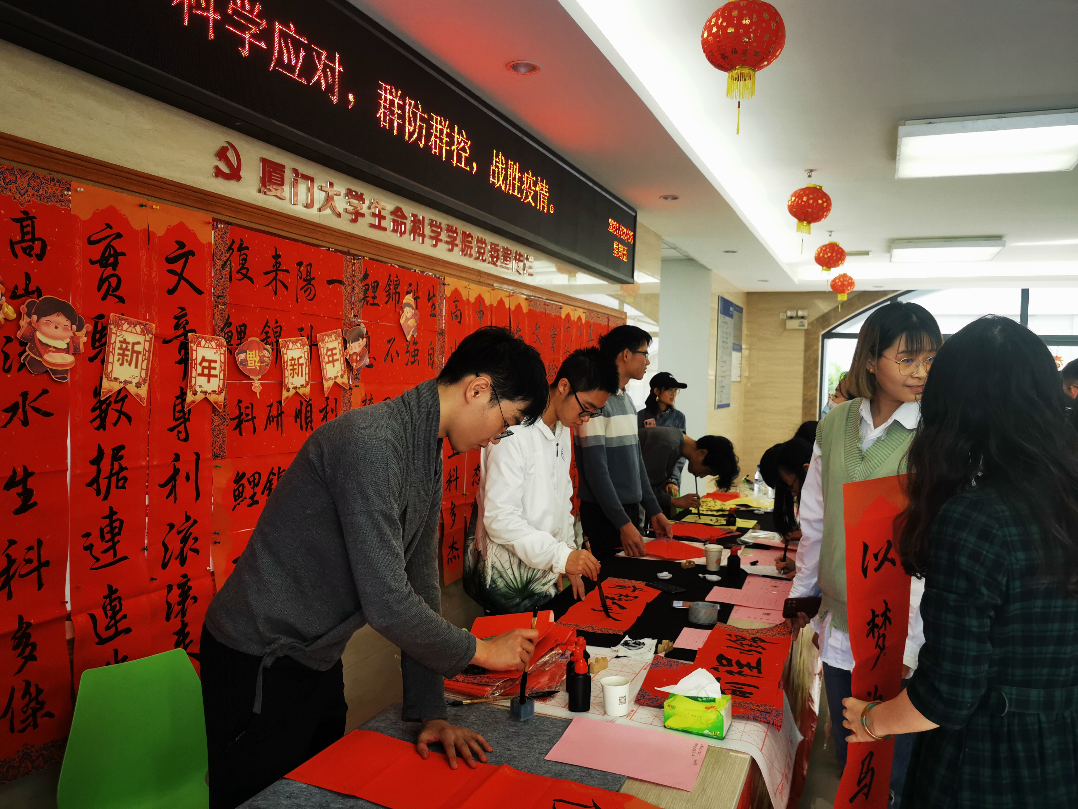 “以梦为马不负韶华,保持热爱奔赴山海”、“牛转乾坤春荡漾,生科学子喜洋洋”、“生科锦鲤,乘风破浪”……书法爱好者个个神情专注,将手笔饱蘸墨汁,在大红的对联纸上奋笔疾书。2月5日,距离春节不到一周的时间,生命科学学院组织留校师生开展“迎新春 贴对联 送祝福”活动,书法爱好者们为全院留校师生免费写春联、赠春联,他们挥毫泼墨,用喜庆的对联和火红的“福”字,向全院师生致以新春美好的祝愿,让大家切实感受到中国传统文化魅力和浓郁的节日气息。厦门大学副校长、生命科学学院院长周大旺、生命科学学院党委书记左正宏等近300余名师生参与了此次活动。