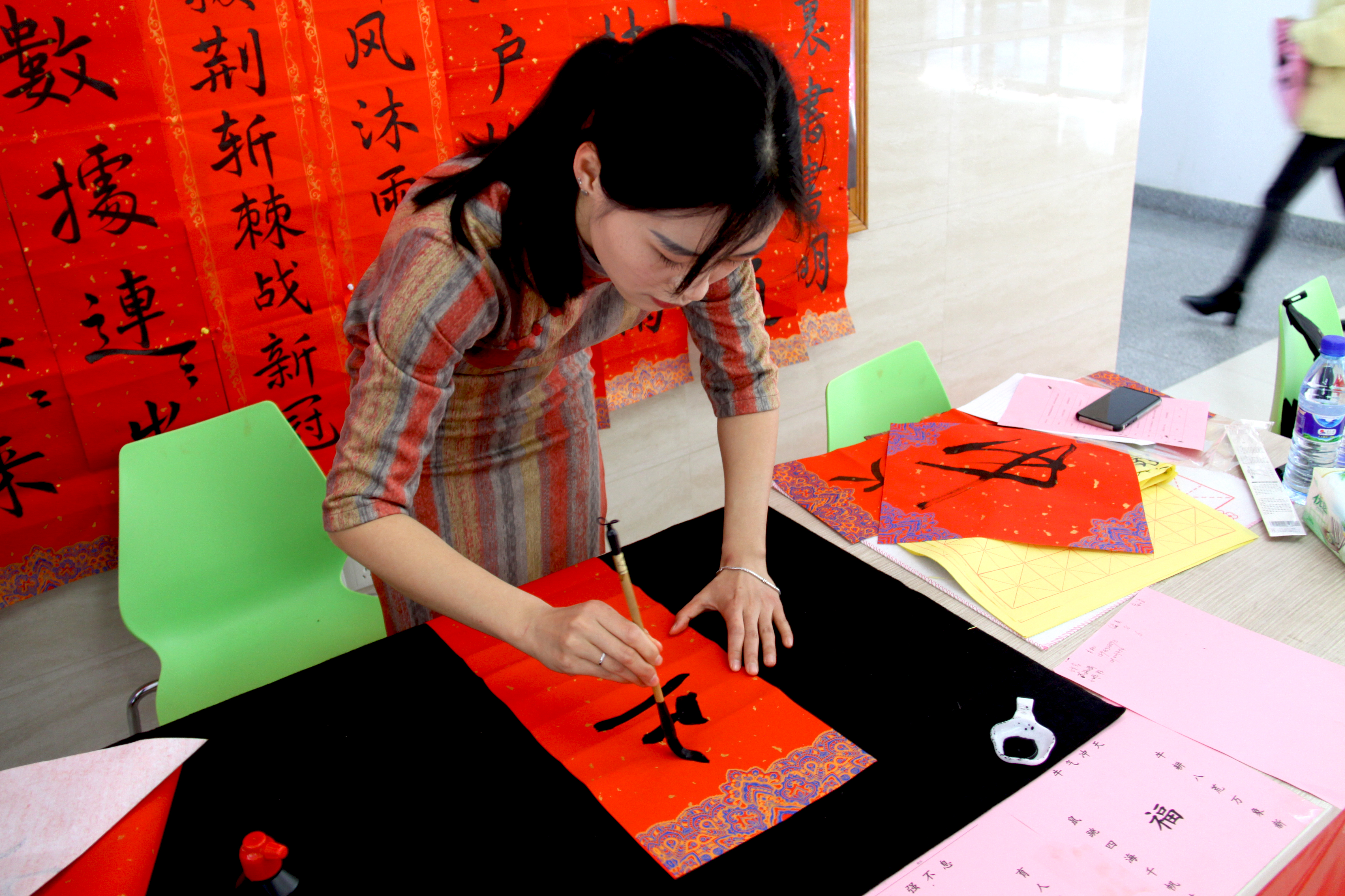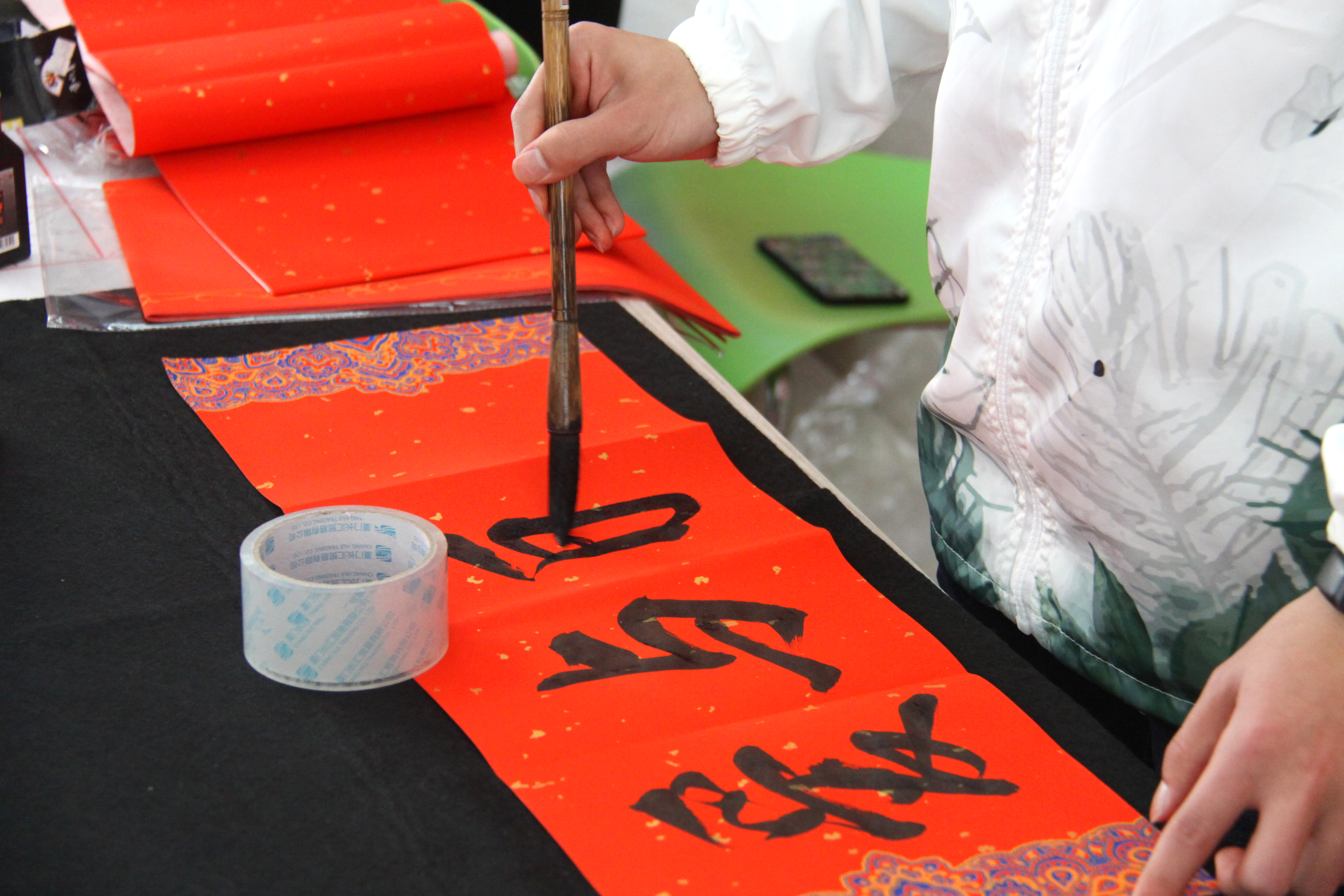 为落实疫情防控的要求,确保留校师生有序领取春联,研究会学生干部和书法爱好者一大早就到达活动现场,提前做好各项准备工作。他们拉横幅,悬绳晾春联,摆好了书桌,放上了笔墨纸砚,还为前来领取春联的师生摆好了展台。活动现场,书法爱好者们带着新年的祝福,笔走龙蛇,有求必应,个个忙得不亦乐乎,一副副寓意吉祥的对联、风格不同的书法作品跃然纸上,黄朝阳楼E栋大厅被红彤彤的春联渲染,春节的喜庆气氛洋溢着整个活动现场。