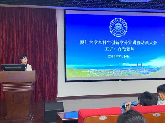 11月4日中午由生命科学学院学生会科创部主办的“厦门大学本科生创新学分宣讲暨动员大会”在学院五楼报告厅举行。大会由科创部干事谭豪尹主持,邀请了生命科学学院教学部副主任石艳老师和19级本科生章雅雯介绍创新学分相关信息。全体2020级本科生均参与了本次大会,同学们积极提问、热烈互动,在宣讲会上收获满满。