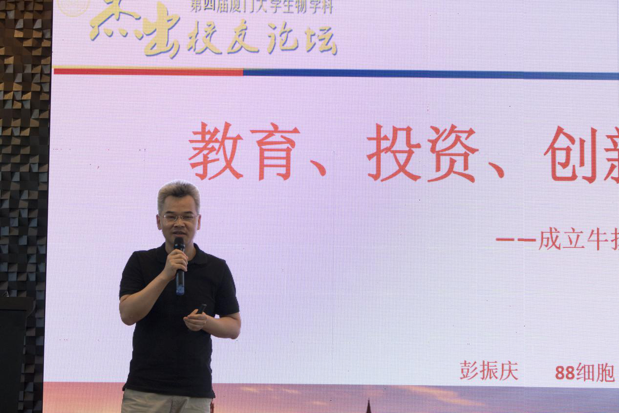 校友论坛第一位报告人是1988级细胞生物学专业校友彭振庆,目前从事股权与证券投资相关工作,任厦门牛扬投资管理有限公司董事总经理,公司为在中国证券投资基金业协会备案的阳光私募基金管理机构。现任厦门大学厦门校友会生命科学分会秘书长,厦门大学生命科学学院创业导师,热心校友、公益事业,2019年作为校友代表在厦门大学毕业典礼上发表演讲。