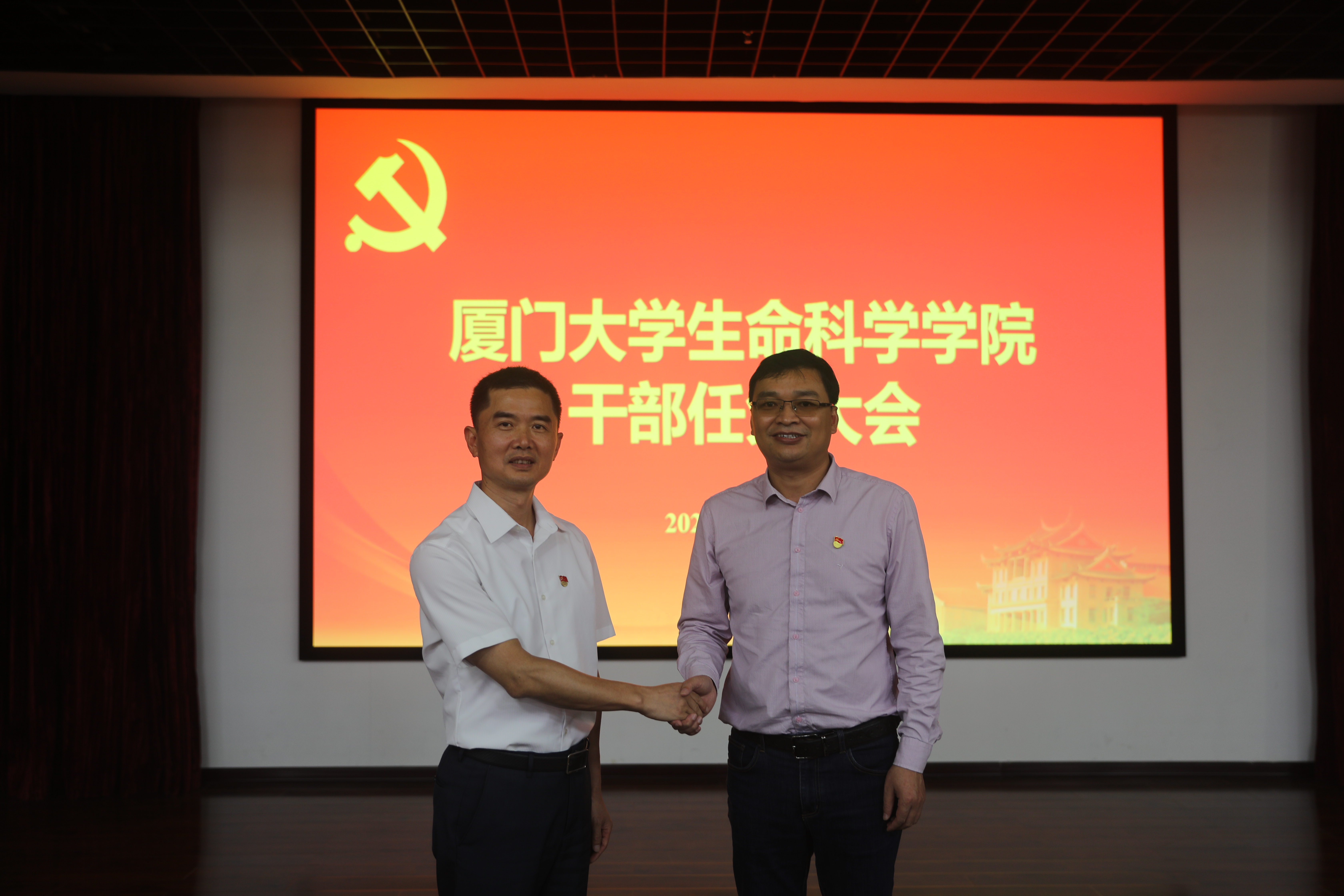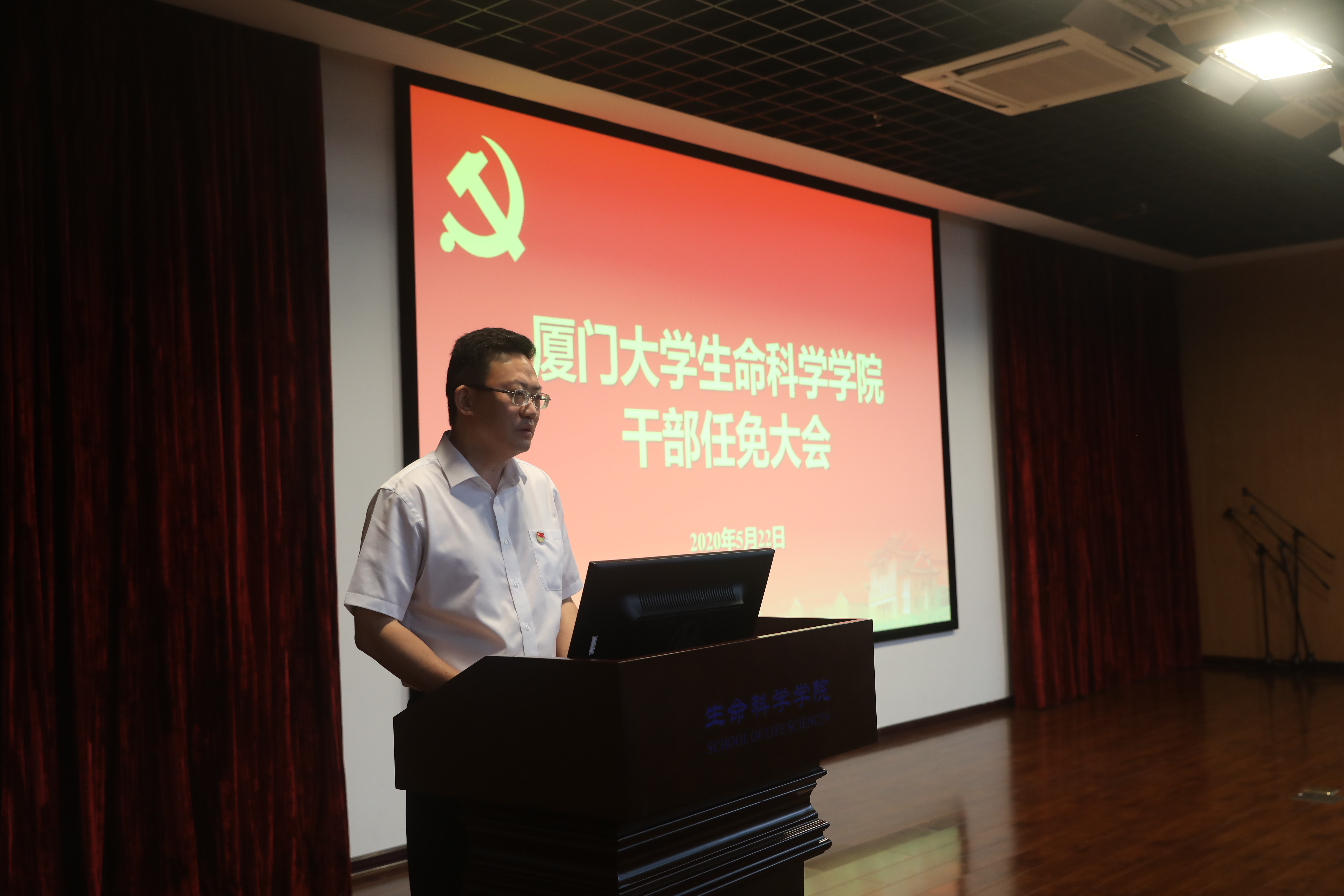 李建发代表学校党委宣读了关于生命科学学院党委书记的任免决定:左正宏同志任中共厦门大学生命科学学院委员会书记,张明智同志不再担任中共厦门大学生命科学学院委员会书记、委员职务,左正宏同志不再担任厦门大学生命科学学院副院长职务。他代表校党委高度肯定了张明智同志为生命科学学院发展所做出的贡献,对他为学院建设和发展所付出的心血和努力表示衷心的感谢。同时,他代表学校党委对新的领导班子提出了五点希望:一是认真履行职责,紧密围绕学校中心工作,立足学院实际,扎实推进学校各项工作任务在学院层面得到全面贯彻落实;二是加强领导班子建设,切实提高政治站位,加强理论武装和思想政治建设,坚持和健全民主集中制;三是锐意进取,改革创新,推动学院各项事业全面协调、快速、可持续发展;四是牢固树立宗旨意识,以师生为中心谋划事业发展,全心全意为师生服务;五是坚持党务、业务公开,使师生员工参与到学院发展中,自觉接受师生员工的监督。他表示相信在学院党政班子的团结带领下,学院全体师生员工一定能坚定信心、奋力拼搏,取得更大的成绩。
