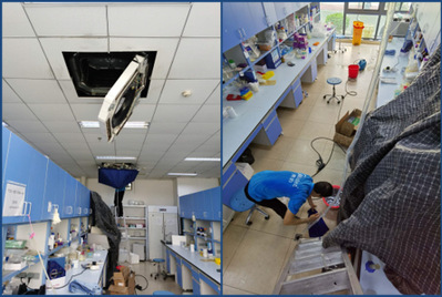 施工期间,学院在校师生通力配合,工作人员按照疫情期间防范要求做好个人防护,遵照严格规范的作业流程,对空调面板、滤网、内部翅片、叶轮等零部件及机体进行擦拭、喷蒸、消毒等全方位的清洁处理;同时,做好周边环境、实验设备的保护。