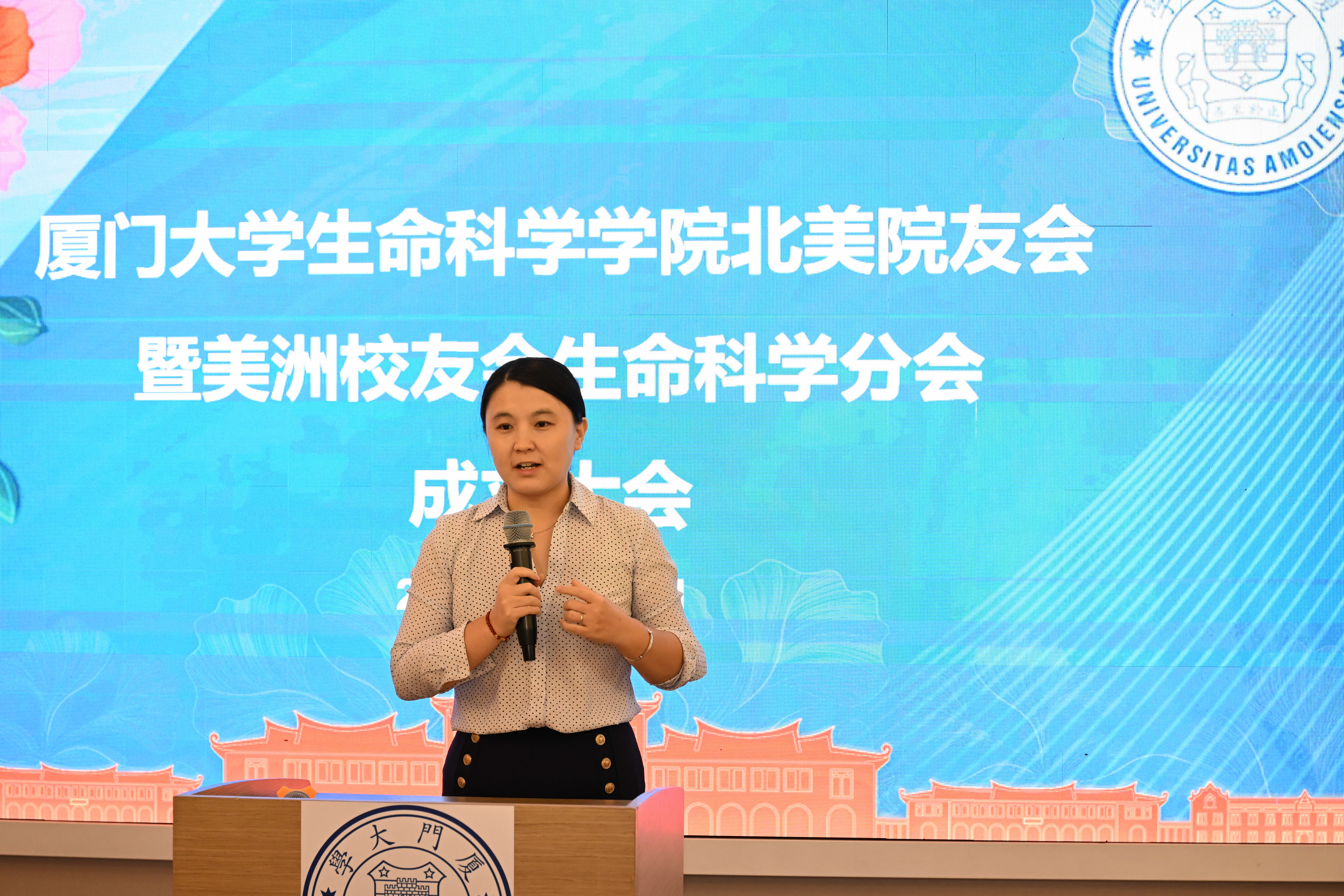 厦门大学美洲校友会理事长孙淑婷致辞并祝贺分会成立。她表示,生科分会是美洲校友会大家庭的重要组成部分,她将全力支持分会开展工作,建立母校与校友沟通的桥梁,更加紧密地联系校友、服务校友。