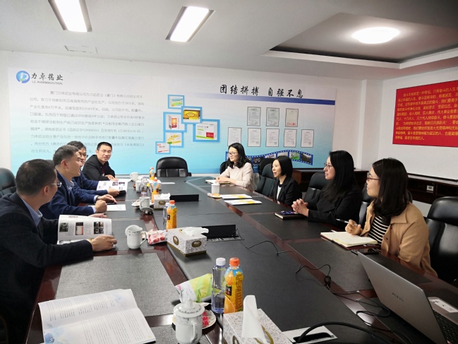 在力品药业(厦门)有限公司,学院领导一行与董事长叶英博士及公司党支部书记进行交流,对叶英博士、力品药业公司长期以来对学院的支持与合作表示感谢。过去几年,双方在人才培养、项目合作方面保持了良好的合作关系,希望今后进一步深化在学生实习实践、人才招聘等方面工作。同时,2019年学院党委与力品药业签署了党建合作共建协议,双方在党建方面的共建也将进一步推进。叶英博士介绍了力品药业这一年来在项目、专利方面取得的成绩,并表示,作为学院的兼职教授,她十分关心学院的发展,也希望接下来双方的合作关系更加紧密,未来多多支持学院的发展。