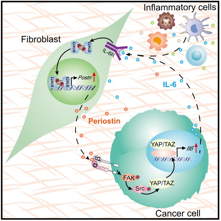 在该项研究中,研究人员应用AOM/DSS小鼠模型发现敲除Periostin可显著抑制小鼠肠炎相关肠癌的发生,发现Periostin蛋白可通过促进炎症诱导的早期组织病变来影响肠炎相关肠癌的形成。该研究进一步应用APCmin/+小鼠发现敲除Periostin可显著抑制小鼠肠腺瘤的发生。进一步的体内体外实验表明,组织微环境中成纤维细胞来源的Periostin蛋白可通过Integrin-FAK-Src信号的介导增强肿瘤细胞中YAP/TAZ的入核,进而促进结直肠癌细胞增殖;而Periostin依赖的YAP活化则可导致肿瘤细胞分泌IL-6因子进而促进成纤维细胞的活化及Periostin蛋白表达,这种由组织微环境因子Periostin和IL-6介导的肿瘤细胞与基质细胞相互作用共同促进肠炎相关肠癌的发生。该研究首次阐明了Periostin蛋白在炎症相关肿瘤发生发展中的功能及其作用机制,并可能为肠炎相关肠癌的治疗提供新的靶点。