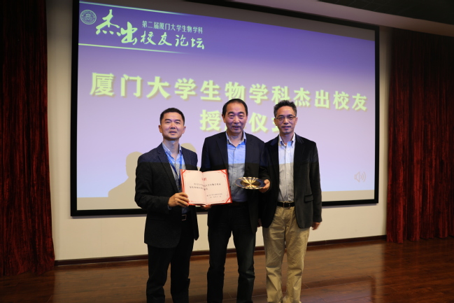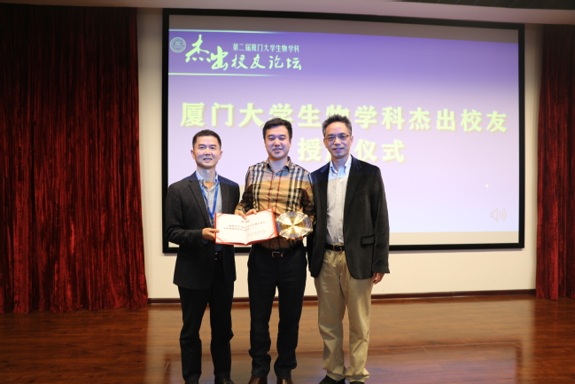 接着,论坛举行厦门大学生物学科杰出校友授牌仪式,张明智书记、周大旺院长为唐亮校友、路杨校友、何南海校友颁发厦门大学生物学科杰出校友纪念牌和厦门大学生物学科百年庆典顾问委员会委员聘书。