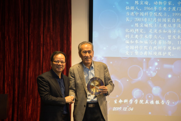 讲座伊始,林圣彩教授代表学院欢迎陈宜瑜院士的到来,并向师生介绍了陈宜瑜院士的求学经历和学术履历,随后为陈宜瑜院士颁发“厦门大学生物学科杰出校友”纪念牌。
